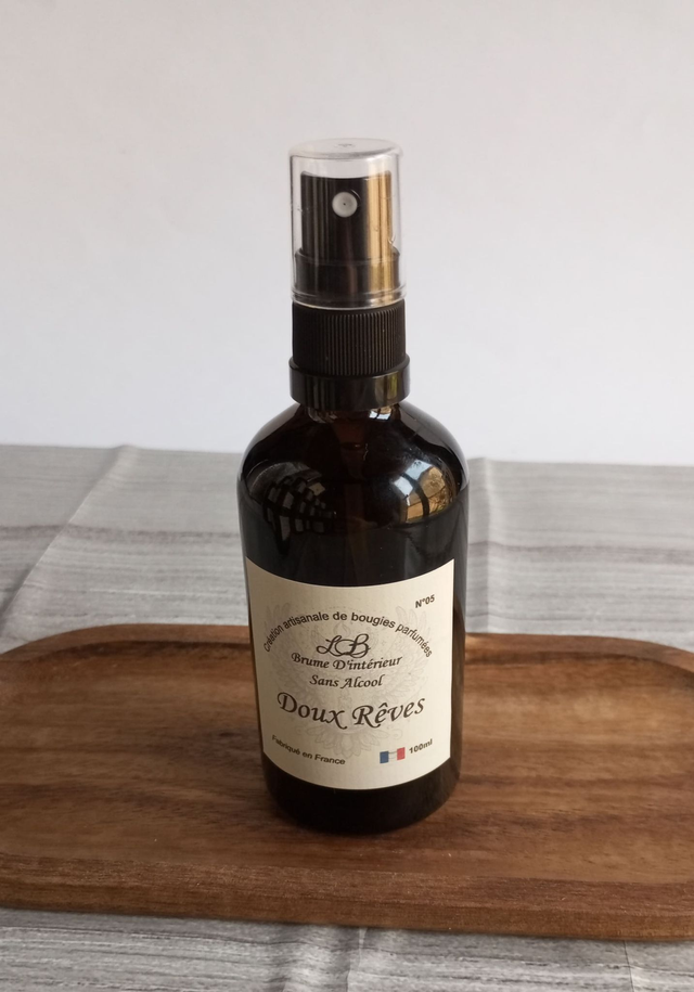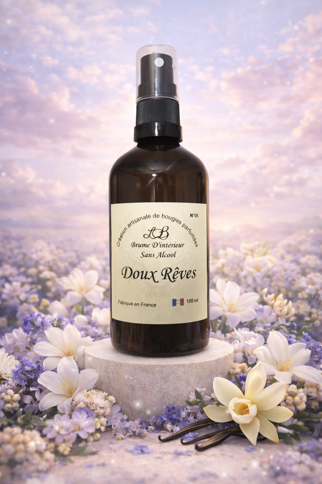 Doux Rêves est une brume artisanale sans alcool aux notes douces et florales. Elle invite à la détente et à un sommeil paisible. Idéale dans la chambre, pour créer une ambiance relaxante et apaisante avant la nuit.