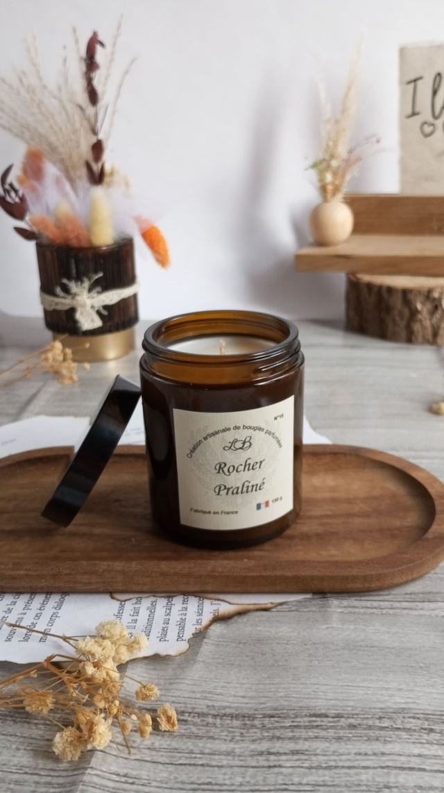 Rocher Praliné est une bougie artisanale parfumée aux notes gourmandes de chocolat et de noisette. Elle diffuse une ambiance chaleureuse et réconfortante, parfaite pour les moments cocooning. Idéale dans la cuisine ou le salon, pour une atmosphère gourmande et douce.